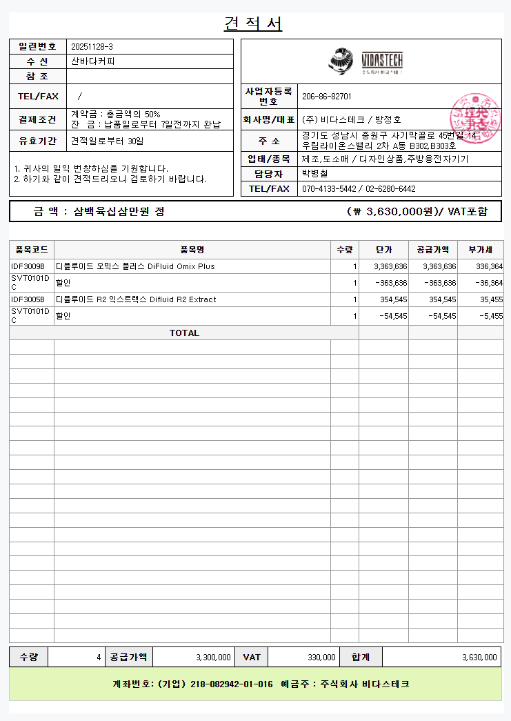 2. 주문 마감 시간 이후에는 카카오톡 채널 (ID:디플루이드코리아) 및 마이페이지 내 1:1 문의 게시판으로 접수 부탁드립니다.